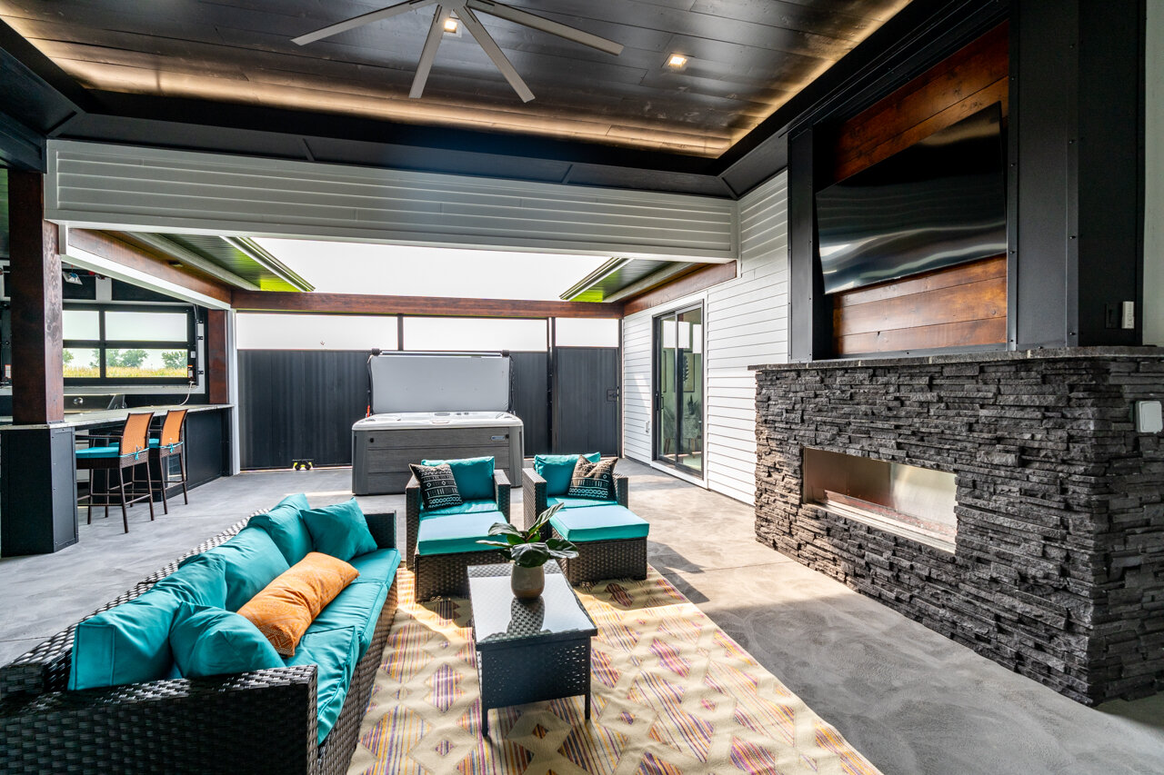 This unique, picturesque, and covered entertainment area has a huge sliding barn door, Gas insert fireplace and outdoor kitchen.